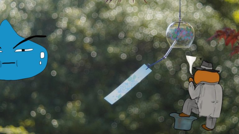 画像説明:【風鈴は文化?】季節外れのトレンディー俳優(笑)について息子に解説するタヌキの図