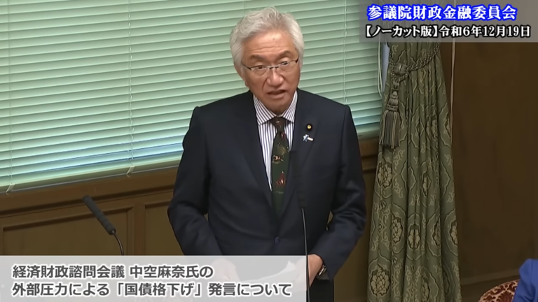 画像出典:西田昌司チャンネル:加藤大臣、この発言を放置していいのですか!経済財政諮問会議 中空麻奈氏の「国債格下げ圧力」発言(参議院財政金融委員会 質問 令和6年12月19日)(スクショ)