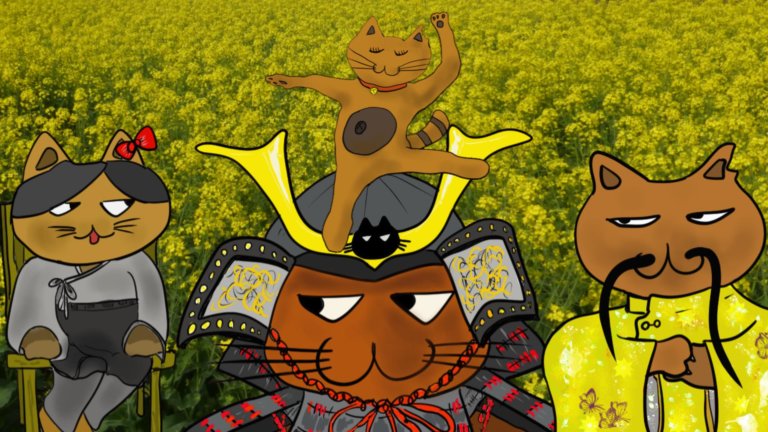 画像説明:【はいチーズ!】お花畑にて各国を代表するコスプレに勤しむタヌキの図