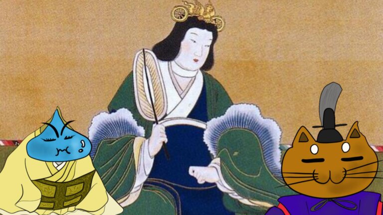 画像説明:【推古天皇肖像「土佐光芳」画・叡福寺蔵】最初の女帝に伺候するケモノ衆の図