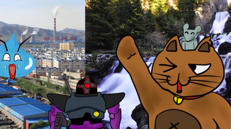 画像説明:【某MSを借りて】ウルムチの滝は民意の証・あっちには原発・・応援するぜ!ウイグル人達♡の図