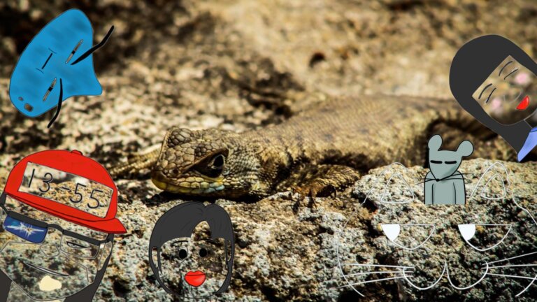 画像説明:【擬態は野心を隠す常套手段】トカゲさんにかくれんぼの極意を学ぶタヌキ一家の図