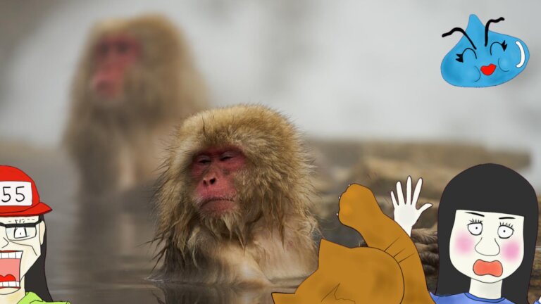 画像説明:【お前加藤か?】気持ちよく入浴中の猿にちょっかいをかけるタヌキの図