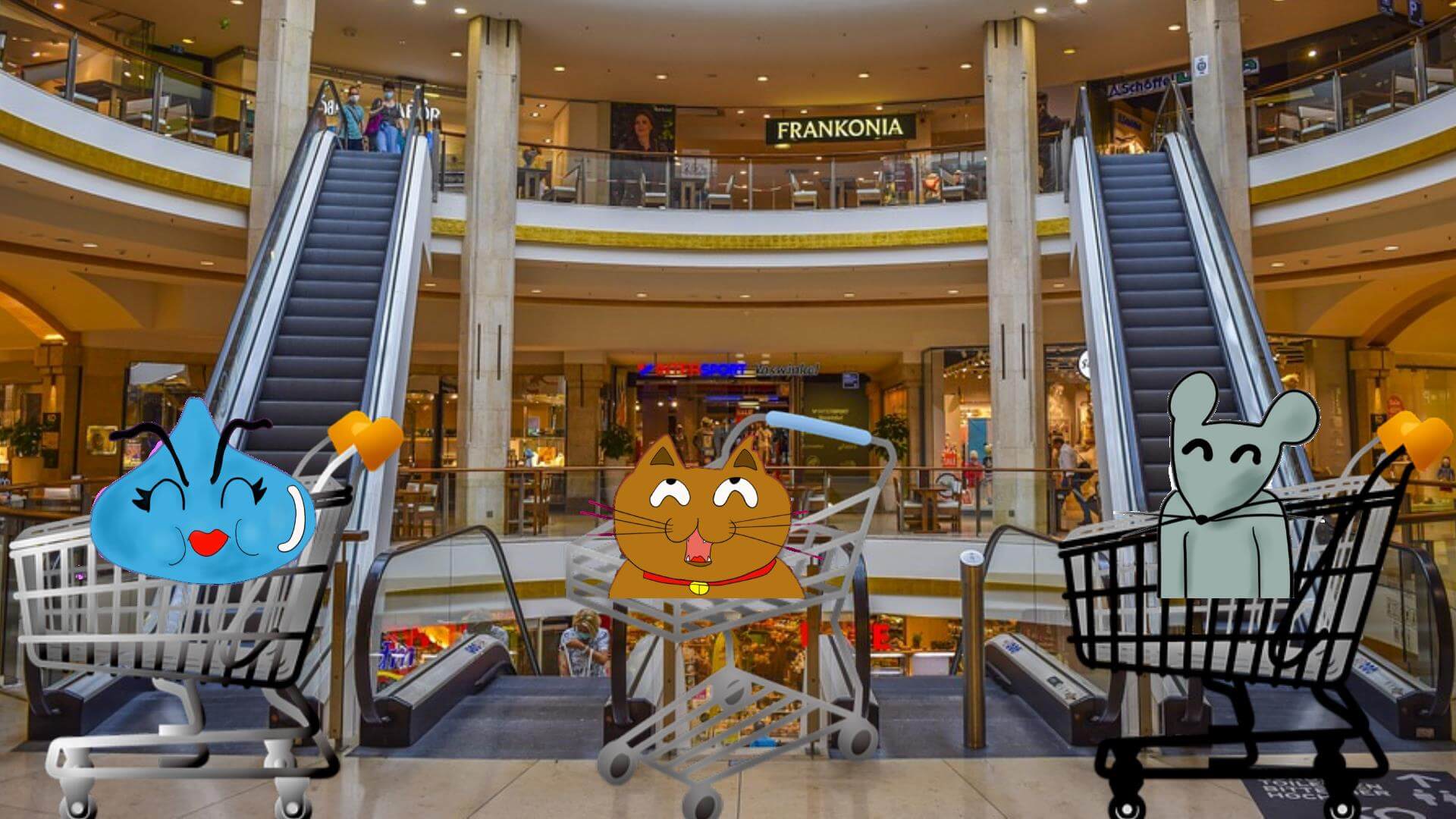 画像説明:ブンブ~ン!】カートの意味を分かっていない買い物に不慣れなケモノ衆の図