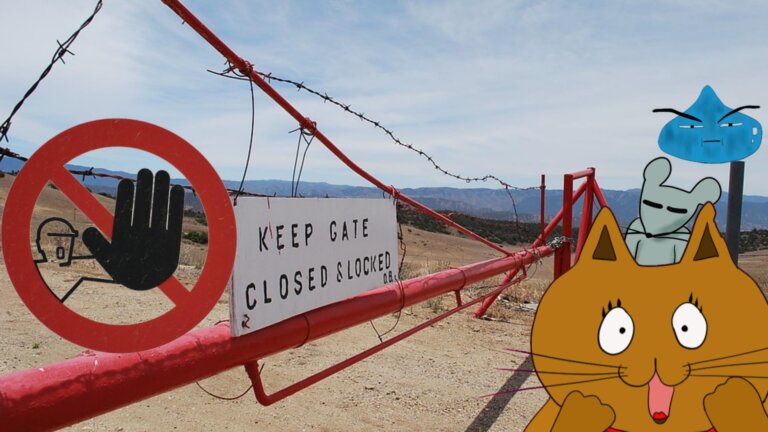 画像説明:【国境はガバガバ・県境は越えるな】知事たちの不思議な呪文の先を確認するケモノ衆の図