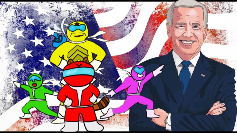 画像説明:【USA!USA!USA!】なぜか大分県の宇佐市を連呼するコスプレタヌキ一家の図