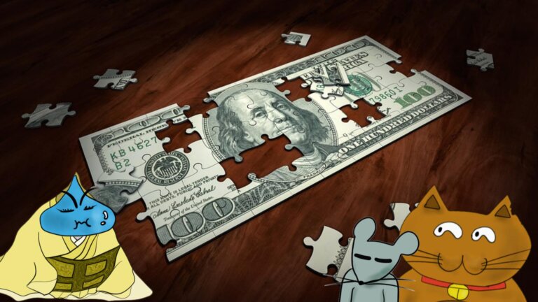 画像説明:【金融の正体】ただの紙切れをパズルにして遊ぶケモノ衆の図