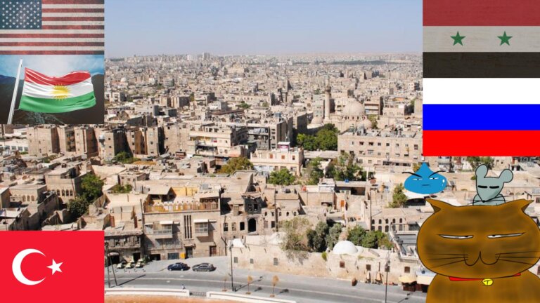 画像説明:【シリア・アレッポ旧市街】関係各国を紹介するお節介なケモノ衆の図