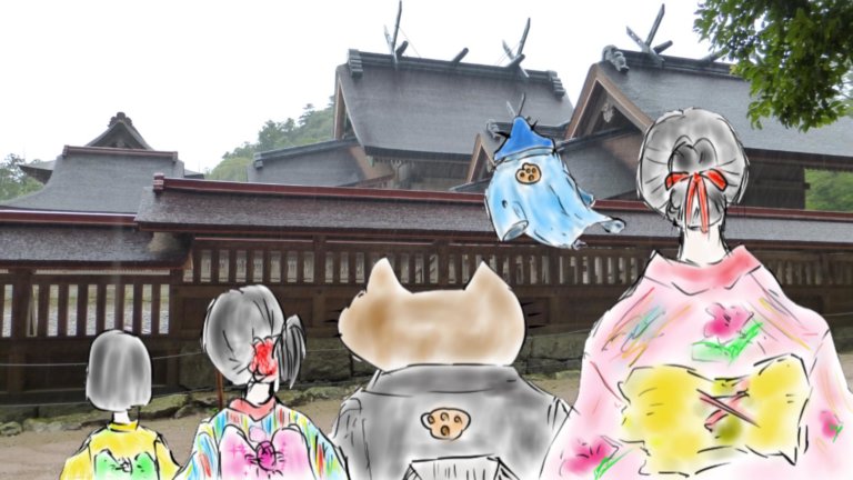 画像説明:【出雲観光】出雲大社で勝手に天皇主権の確認をするタヌキ一家の図