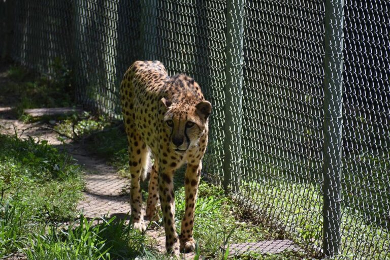 画像説明:【檻と重税と生活苦=現代日本】飼育員と檻の中の環境に不満がありそうなチーターさんの図