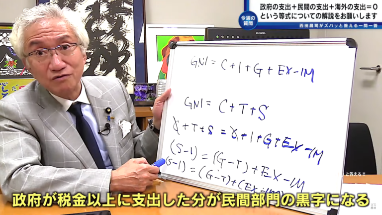 画像出典:「週刊西田」:「政府の赤字は民間の黒字になる。民間が黒字でも貯蓄超過なのは投資先がないから。財政が破綻しないことを証明する計算式を解説」西田昌司がズバッと答える一問一答【週刊西田】スクショ