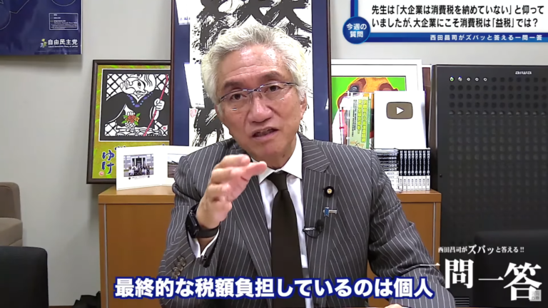 画像出典:「週刊西田」:「先生は以前、Youtubeで「大企業は消費税を納めていない」とおっしゃっていました。それでは大企業にこそ、消費税は「益税」ではないでしょうか?」西田昌司がズバッと答える一問一答【週刊西田】