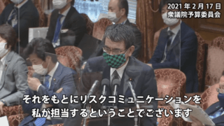 ウイルス・ワクチン 証拠映像:「ワクチン」逃げ得を許さない為に・・ 2021年2月17日・衆議院予算委員会で河野ワクチン担当大臣は「国民の皆様に正確な情報をお伝えをして、ワクチン接種を受けていただくために私がロジとリスクコミュニケーションを担当いたします」と発言。彼は『単なる運び屋』ではありません。 ウイルス・ワクチン